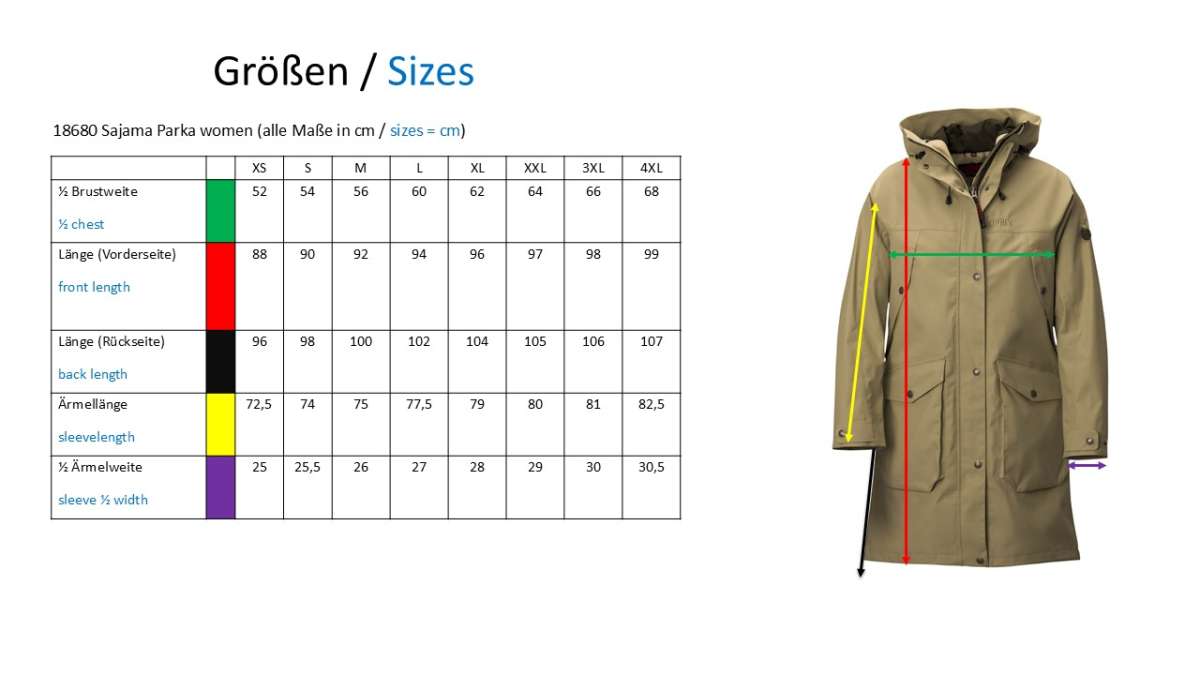 Die Weite der Ärmelabschlüsse lässt sich durch die Druckknöpfe variieren und mit Hilfe der Gummizüge im Inneren lassen sich die Taillien- und Saumweite einfach verstellen. Die feste Kapuze ist in der Länge und Weite individuell anpassbar und in Kombination mit dem hochschließenden Kragen und dem komplett umlaufenden Schirm bietet sie bestmöglichen Schutz vor Nässe, Wind und Kälte. Die Jacke verfügt über einen YKK-2-Wege-Frontreißverschluss, der eine flexible Möglichkeit bietet, die Jacke von oben oder unten zu öffnen. Die Abdeckleiste über dem Reißverschluss lässt sich mit den Druckknöpfen verschließen und sorgt so zusätzlich für Wind- und Regenschutz.