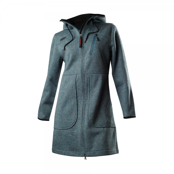 Damen-Softshellmantel aus winddichtem Material in attraktiver Woll-Optik, mit Kapuze und 2 großen aufgesetzten Fronttaschen mit Karabinern zum Anhängen des Leckerli-Beutels und YKK-2-Wege-Frontreißverschluss.