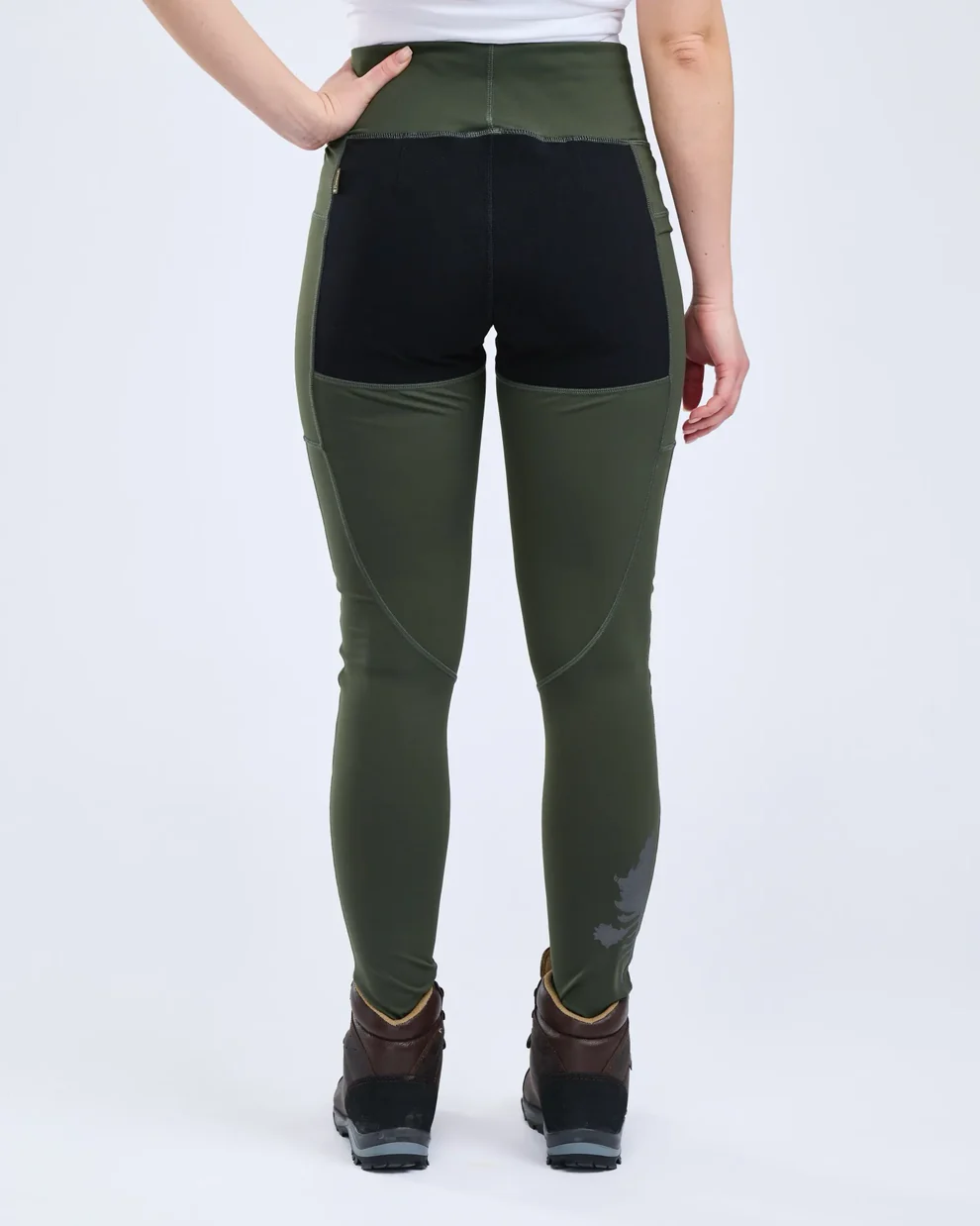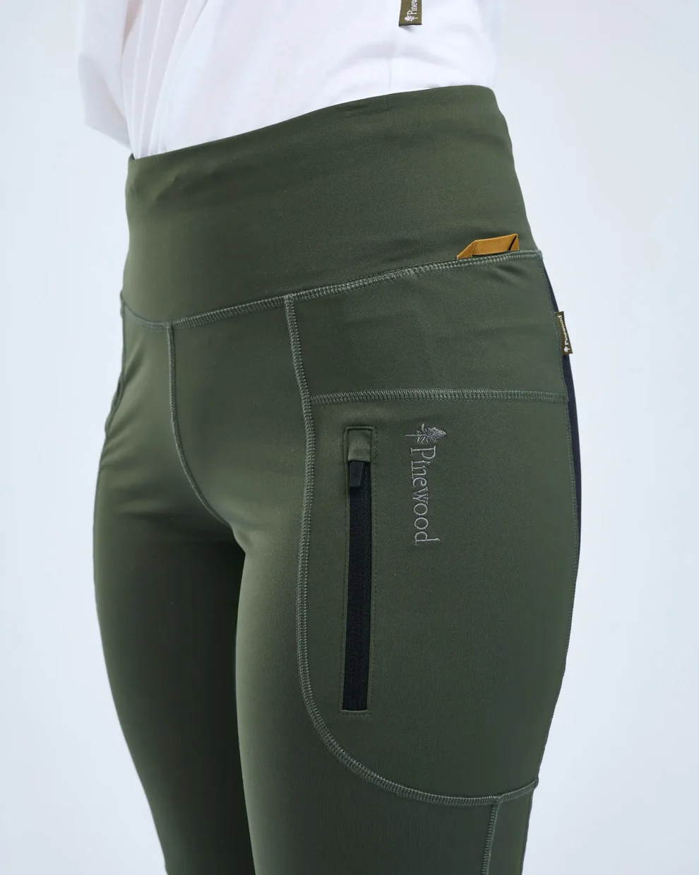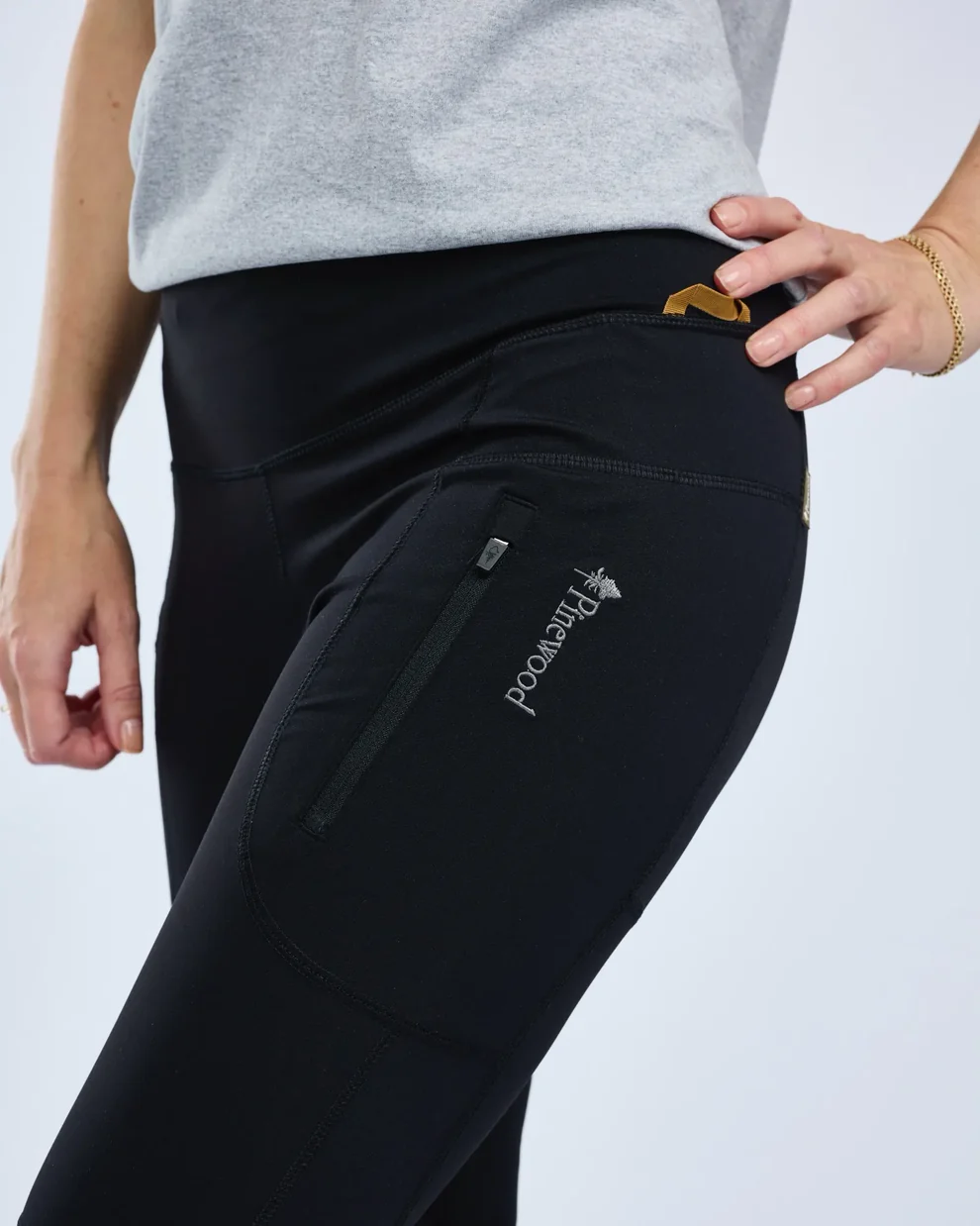 Moderne und praktische hochtaillierte Leggings mit 4-Wege-Stretch, verstärkten Knien und Gesäß, sowie cleveren Taschen. Entdecke ultimativen Komfort und Funktionalität mit dieser überarbeiteten Version der Leggings! Dank eines elastischen Bunds mit verstellbarem Kordelzug bieten sie eine perfekte Passform für jede Aktivität. Auf der linken Seite befindet sich eine sichere Tasche mit Reißverschluss, während die rechte Seite mit einer offenen Tasche mit überlappender Klappe ausgestattet ist – ideal, um Ihr Handy immer griffbereit zu haben. Mit ihrem hohen Bund für zusätzlichen Halt sind diese Leggings mit einem dezenten Pinewood Baum Design am unteren rechten Bein verziert. Das leichte Material mit 4-Wege-Stretch sorgt für volle Bewegungsfreiheit, während die Verstärkungen an Knien und Gesäß Strapazierfähigkeit für alle Abenteuer garantieren.