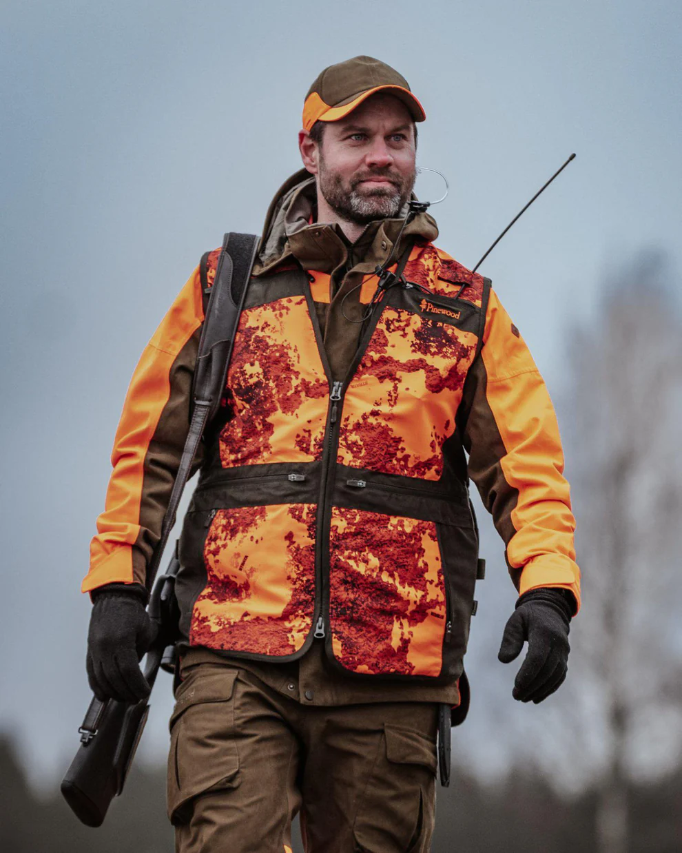 Diese Camouflage-Weste für Herren ist die weiterentwickelte Version der beliebten Hundeführerweste. Das neue Design bietet eine Rückentasche und senkrechte Handwärmetaschen mit Reißverschluss für schnellen Zugriff auf Ausrüstung. Große Fronttaschen mit horizontalen Reißverschlüssen enthalten D-Ringe und Patronenhalter – ideal zum Nachladen. Eine Innentasche mit Reißverschluss sichert Wertsachen, während Funkgerätetaschen mit Klettverschluss die Antenne fixieren; eine Kabelöffnung am Kragen ist ebenfalls vorhanden.