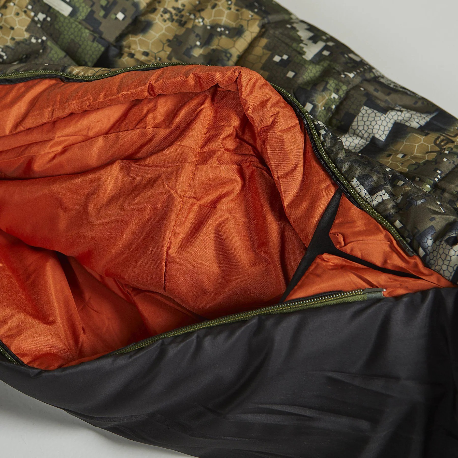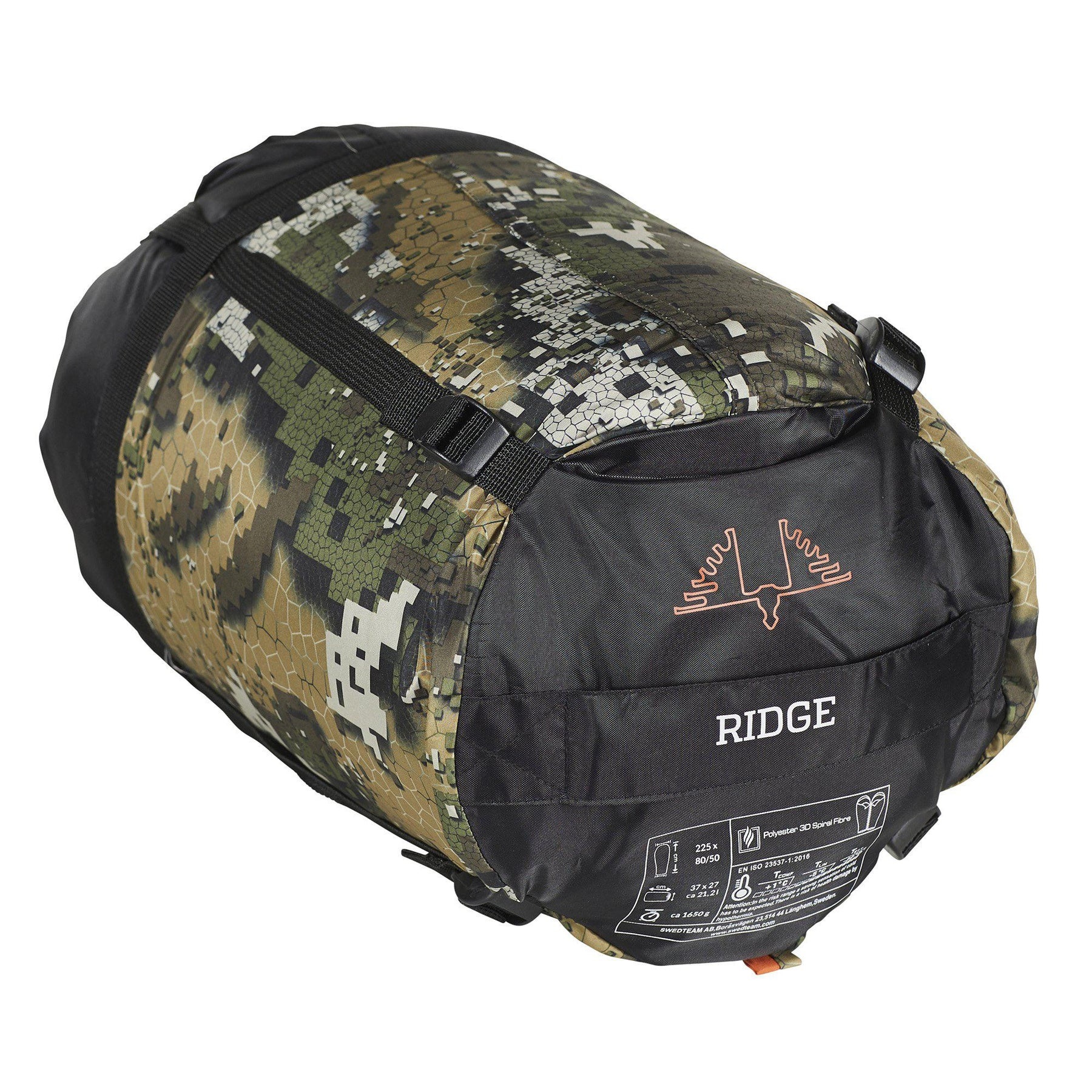 Schlafsack mit dem einzigartigen Camouflage-Muster von DESOLVE®. Warmer Schlafsack mit kleinem Packvolumen. T-Extreme -18 Grad C. Geprüft nach der Norm EN13537. Oberseite in DESOLVE® Veil. Gewicht ca. 1600 Gramm. Länge 225 cm. Breite an den Schultern 80 cm. Länge der Liegefläche 195 cm.